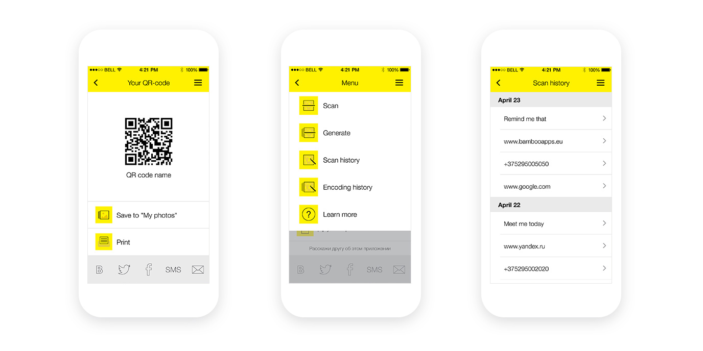 The core idea of the project was to build a quick easy-to-use QR code reader/generator that can operate steadily and reliably on 3 major mobile platforms. This is a cross-platform app and it has same UX/UI for iOS, Android and Windows Mobile platforms. Camera with a fixed focus automatically recognizes any code the device is pointed at. Powerful QR code engine helps to create codes from contact info, URLs, plain text and more. An in-app storage allows to accessing scan history with one tap via integrated web-browser.